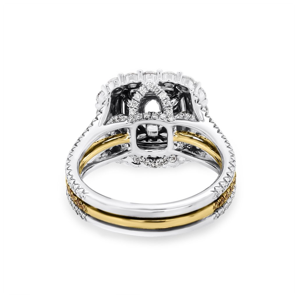 A stunning cushion cut canary diamond rests in a double claw prong setting and a halo of yellow diamonds. The three row band also features a center band of yellow gold and yellow diamonds.