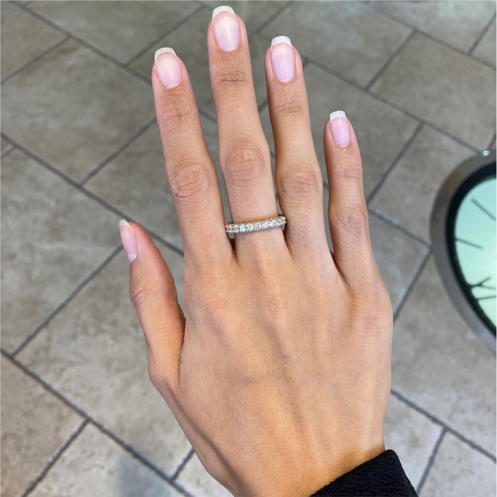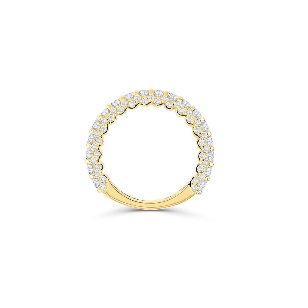 This stunning yellow gold band is set with beautiful round diamond lace throughout the inner and outer face of the ring.