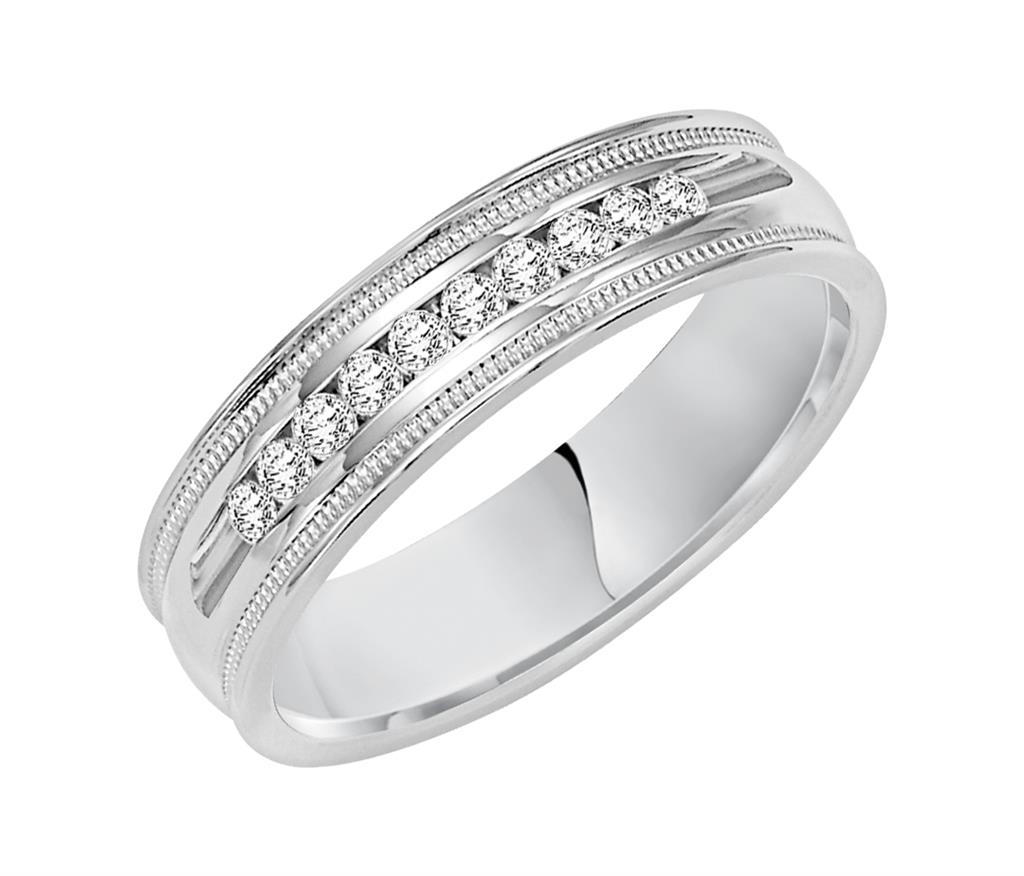 Traditional milgrain paired with a modern, bright finish, round edges and 10 stone channel set diamonds are the perfect combination for this exquisite, Comfort Fit, wedding band.