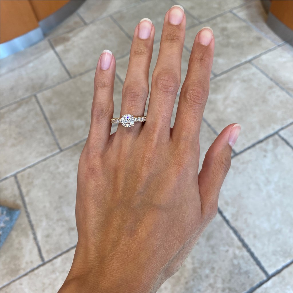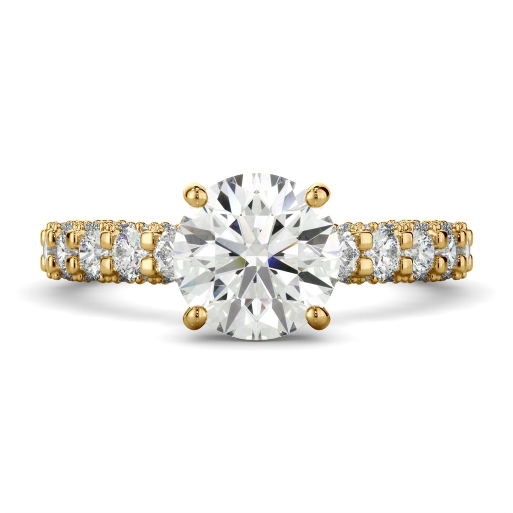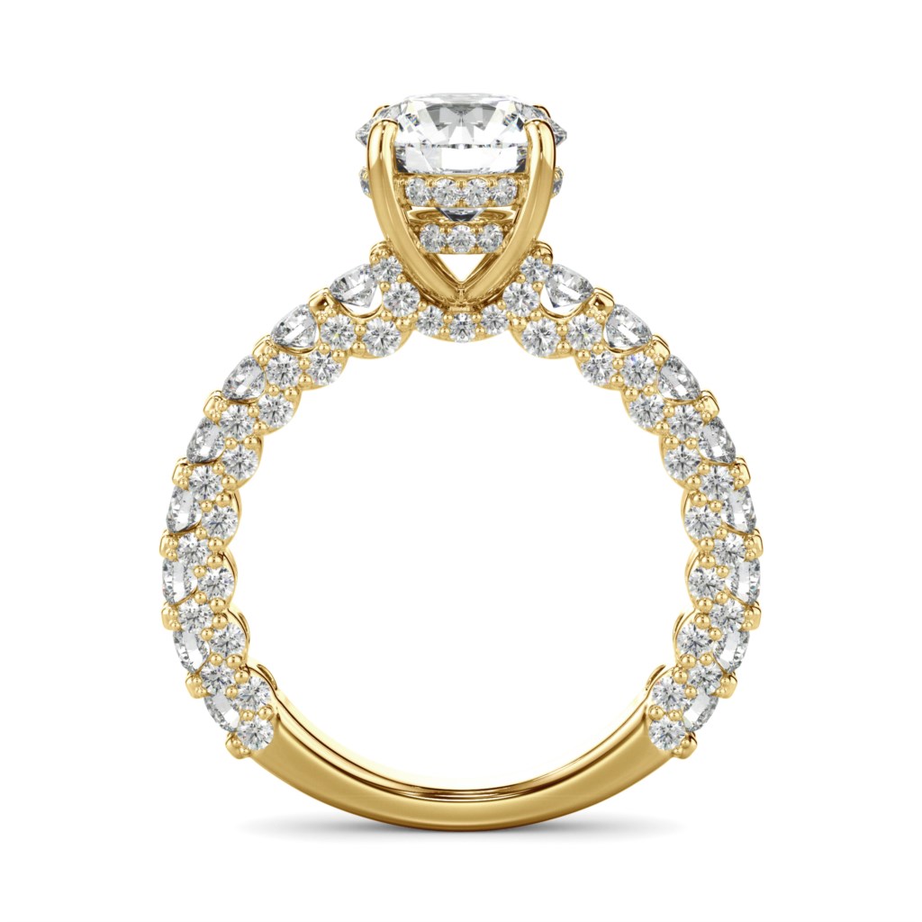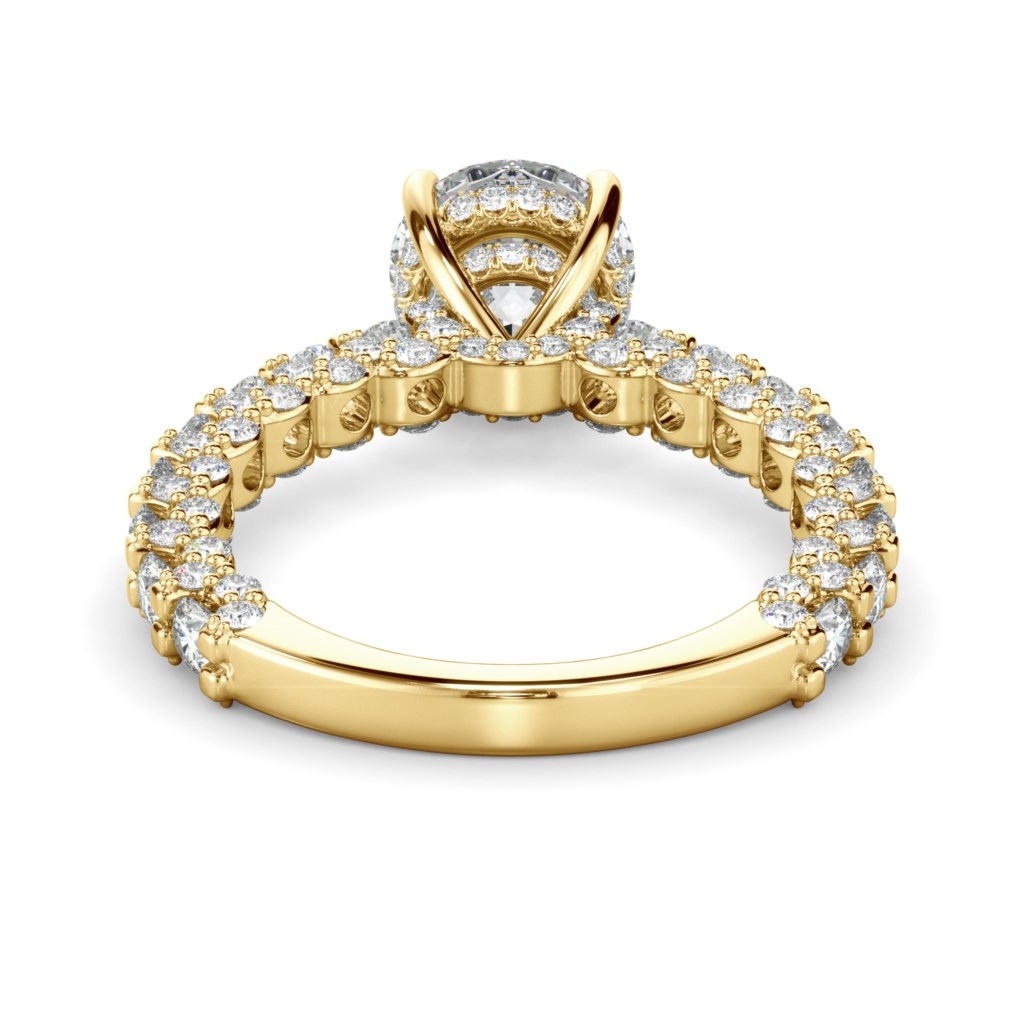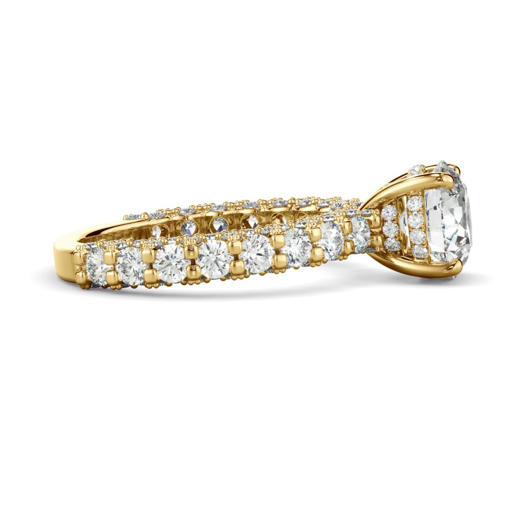 This stunning engagement ring is made with high polished yellow gold, and is set with round diamond lace all throughout the outer, and inner face of the ring. The center stone is held in a two tier hidden halo basket.