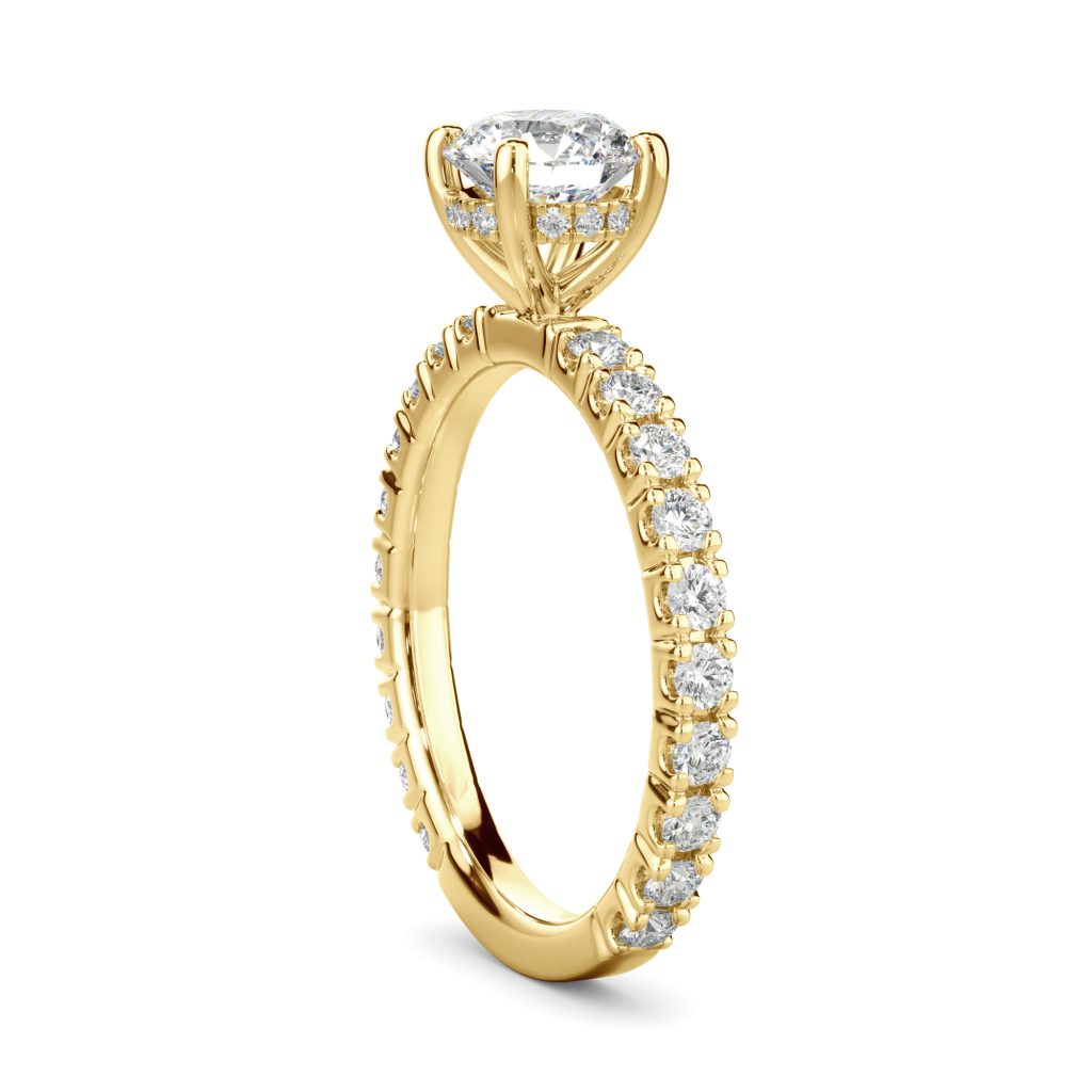 Brilliant round diamonds wrap three quarters of the way around our custom collection band, creating a timeless and elegant look no matter what center stone. Round diamonds are also featured in a hidden halo beneath the center stone for extra sparkle!