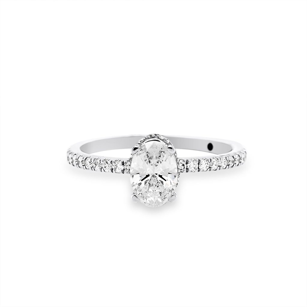 What seems to be a traditional white gold diamond engagement ring has two hidden surprises; a sparkling hidden halo of diamonds around your center stone, and a floating design underneath the center stone as well!