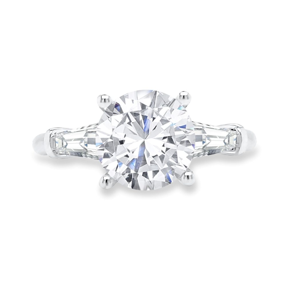 This timeless three stone setting is set with beautiful baguettes, and waiting for the perfect center stone to be set in it.