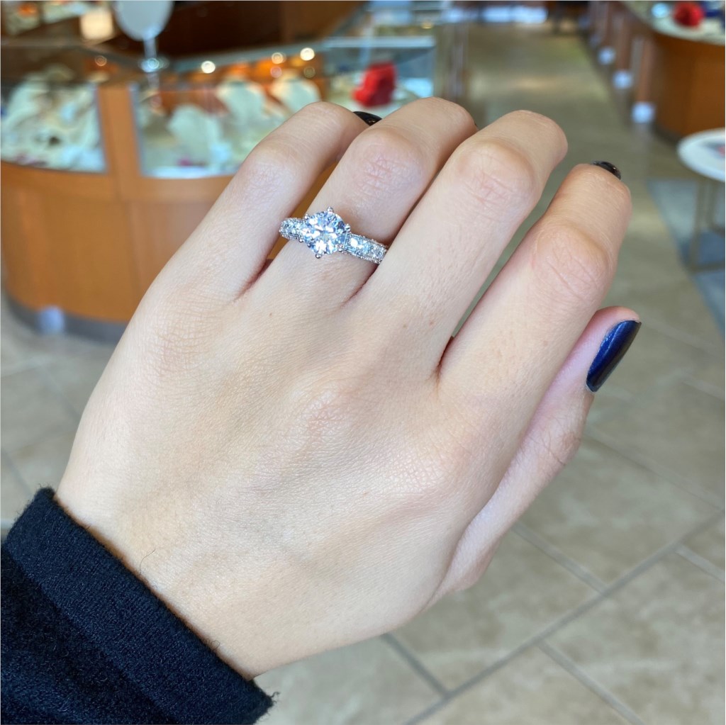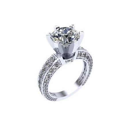 Set in a stunning high polished 14k white gold, 82 round diamonds are set throughout the band to give the round center stone the utmost attention. This ring showcases beauty from any angle!