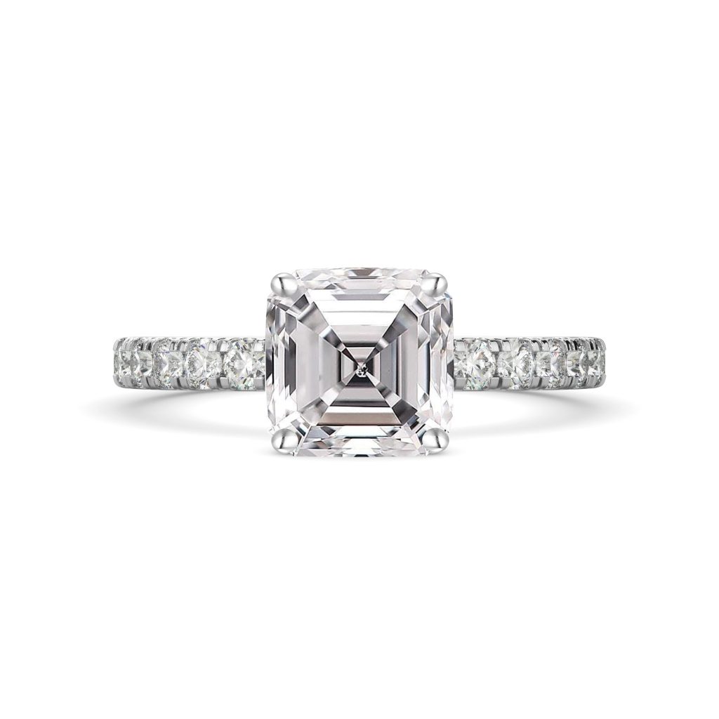 Brilliant round diamonds wrap halfway around our custom collection band, creating a timeless and elegant look no matter what center stone!