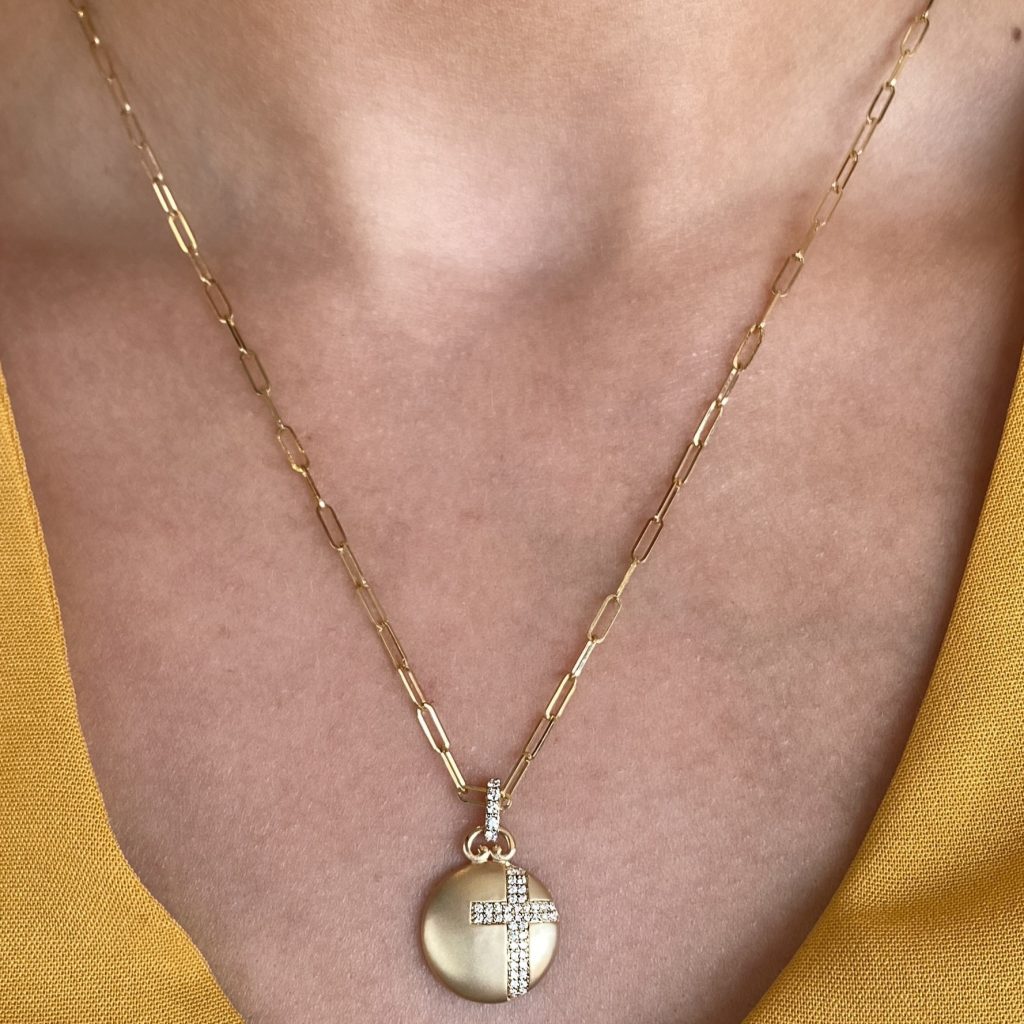 This dazzling diamond cross is set in a matte finish disc that is truly stunning, strung on a trendy paperclip chain.