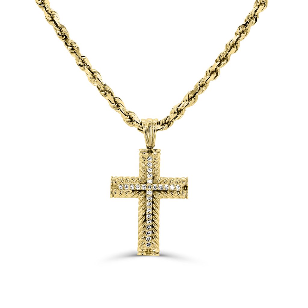 This gold cross features a braided texture with a delicate round diamond cross at the center.