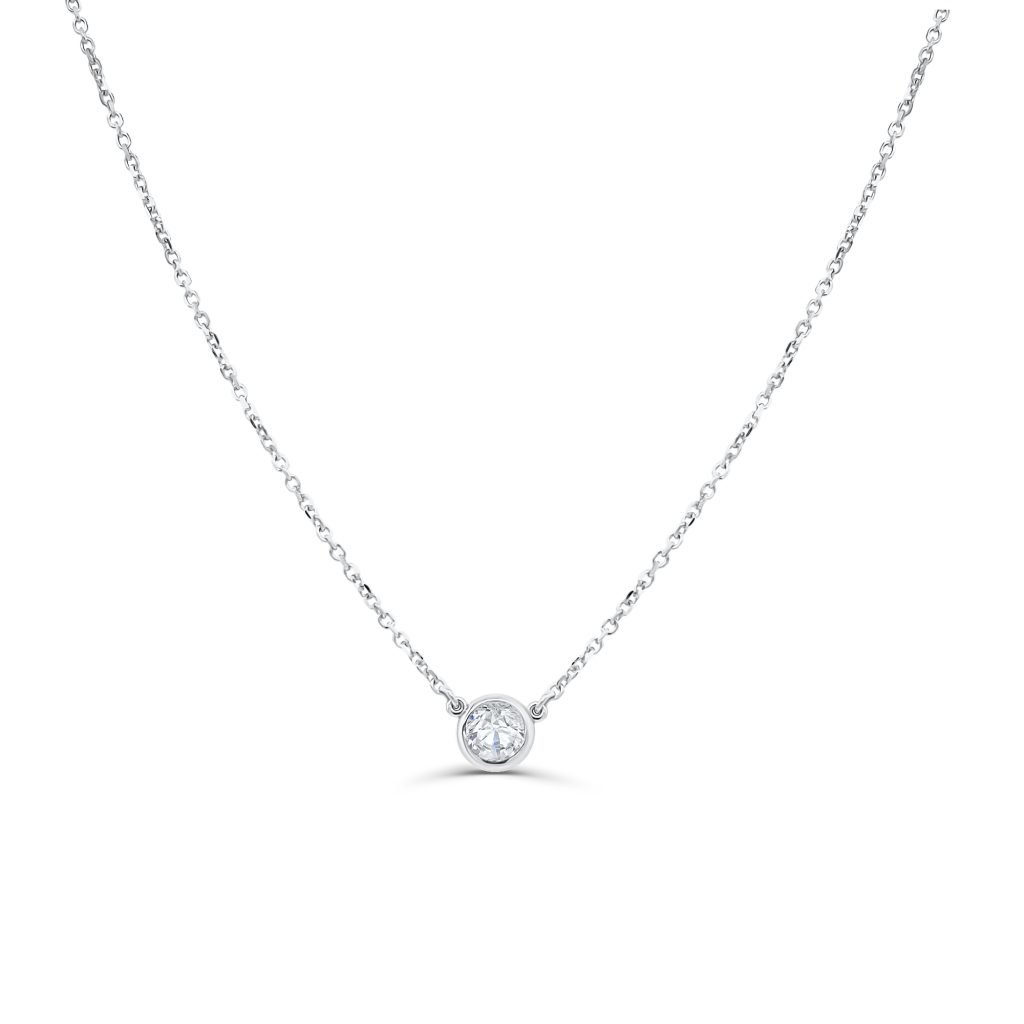 A beautiful petite round diamond rests in a white gold bezel at the center of this white gold chain.