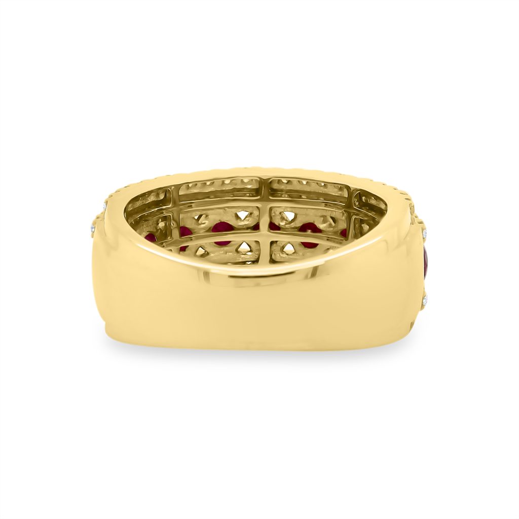Fiery red rubies are paired with 4 rows of sparkling round diamonds, all set in a polished gold wide band ring.