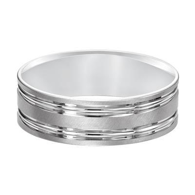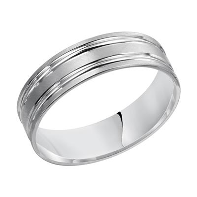 This classic satin finish wedding band features engraved polished rings around the band.